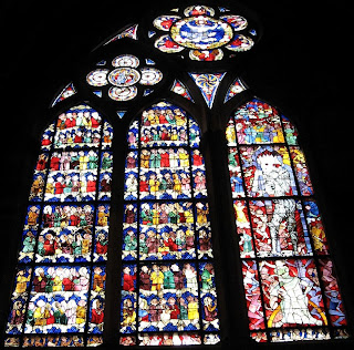 Our next shelter was inside the massive Cathedral. Ornate and "lacy" from the outside, where money seemed to have run out before the second spire could be built, the interior was cool and dark, packed with tourists. There were several interesting monuments and some colourful stained glass windows. The main attraction though was a huge mediaeval astronomical clock.