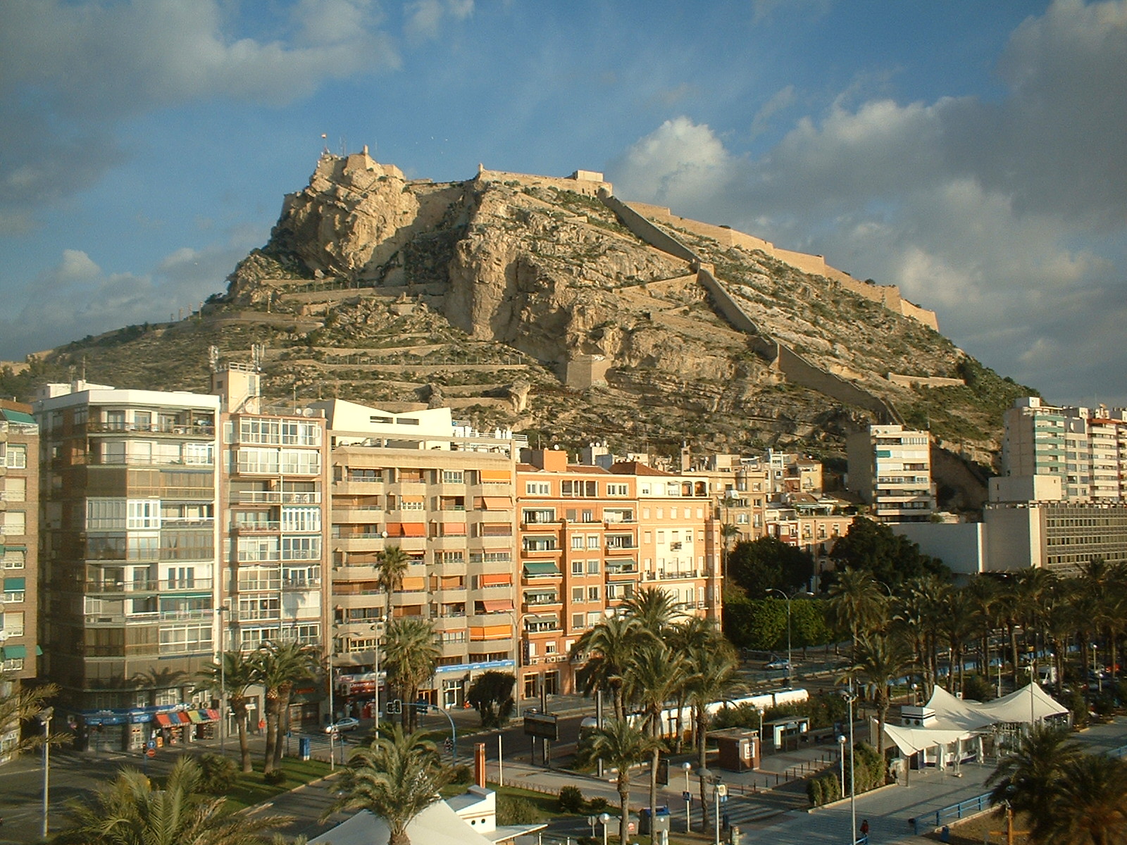 We made our way to the sea front and strolled along the Esplanada de Espana with its varied shrubs and trees, sitting in the shade to watch the families enjoying the weekend sunshine. We continued through the port and back up through the delightful town with its historic town hall in front of which fountains played. In the walls of the main church are lodged cannonballs from English ships that bombarded the town. The castle can be seen high above the beach on top of a massive rock which, with a little imagination, is shaped like a face. This explains why the castle on top of a head forms the town’s coat of arms. A curtain wall runs down the rock to the sea. We went inland to climb up to the castle through gardens. The whole castle precinct was open free of charge and had a range of cafes, shops, souvenir stalls and several displays showing the history of the castle, including an amusing cartoon history of the town with an account of a massive explosion that took place in 1706 when attempting to dislodge English troops. The castle’s history goes back to Iberian times and the area was only handed over by the military relatively recently. The views over the town and harbour and along the coast in both directions are magnificent. All in all a very pleasant day with a lunch of beer and tapas.