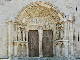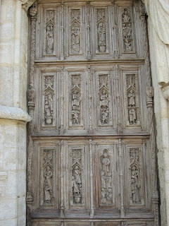 The church was started in about 1260 to receive the relics of St Thibault. It was thought that the architect responsible for the Sainte Chapelle in Paris had a hand in it, and its lightness and loftiness were certainly comparable. The architects had used iron rods to tie together the slender columns. We also learned that the church had in fact been completed but the nave had collapsed after being struck by lightning in 1686. Our suspicions about some of the statuary on the portal were confirmed when we were told that the ubiquitous Viollet-le-Duc had given it a make-over in the 1840s.