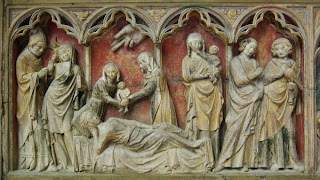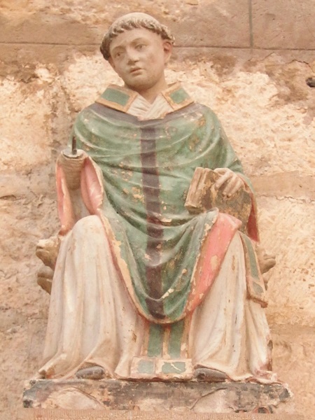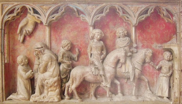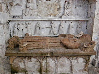 On returning to Modestine we found the door to the priory church was now open. We entered to be dazzled by the slender soaring gothic tracery of the apse, in front of which was a magnificent polychrome 14th century reredos. On it were carved scenes from the life of St Thibault. Inside the priory we found the president of the Friends of Saint-Thibault-en-Auxois, a well-informed and enthusiastic man, who had opened up the church to await the arrival of a conservator who was due to look at the old harmonium. While waiting he showed us around the priory, explaining the images on the reredos and something of the chequered history of the building.