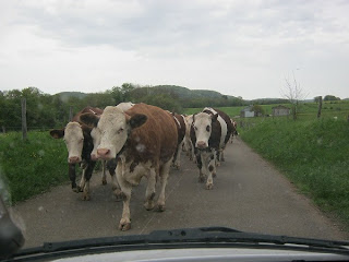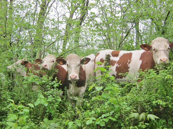 We spent a week with our friends and most of it was wet. We took favourite walks through the woodland, followed by the cattle that roam free on the Clos above the village and were curious to see weird two-legged creatures amongst the dripping trees, wonderful spring buds and blue pervanche flowers. We on the other hand, were more than a little nervous to encounter these frisky creatures deep in the woods where they hustled each other on the narrow track to get closer to us.