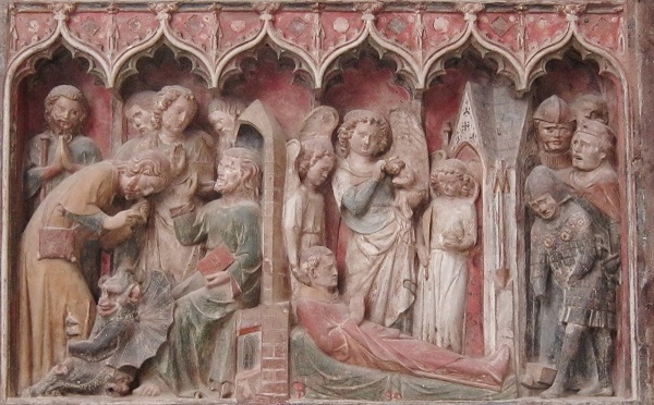 woods in Salanigo near Vicenza where Gautier died. During their travels Thibault seems to have been tempted by a devil, according to the scene on the left. The death of Thibault at Salanigo is shown on the right. He had been joined in his retreat by his mother shortly before his death.