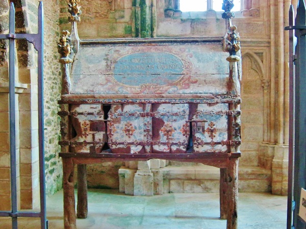 On returning to Modestine we found the door to the priory church was now open. We entered to be dazzled by the slender soaring gothic tracery of the apse, in front of which was a magnificent polychrome 14th century reredos. On it were carved scenes from the life of St Thibault. Inside the priory we found the president of the Friends of Saint-Thibault-en-Auxois, a well-informed and enthusiastic man, who had opened up the church to await the arrival of a conservator who was due to look at the old harmonium. While waiting he showed us around the priory, explaining the images on the reredos and something of the chequered history of the building.