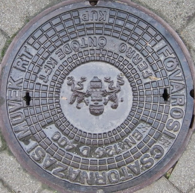We asked but were told by a lady with lovely muddled English that she had no idea who or where manhole covers would have been produced in Hungary though obviously they were. Some of the best and most decorated ones we’ve seen are here. Ian explained his enthusiasm and I complained about being dragged around Europe so Ian could photograph as many as possible. She looked sympathetic but felt that men needed a hobby and took us out into the yard so we could see the one there emblazoned with the name of the company that produces the drainpipes around the city. She suggests we give them a try.